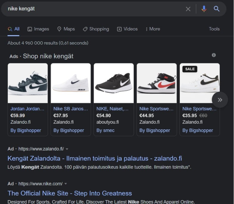 Search intent on se syy miksi haku on tehty. Jos käyttäjä etsii Googlesta termiä “urheilukengät” niin hän mitä todennäköisimmin haluaa ostaa kengät. On epätodennäköistä, että hän haluaa sivuston urheilukenkien historiasta. Jos termillä “urheilukengät” haluaisi sijoittua ensimmäiselle sijalle tällä hetkellä niin sivuston pitäisi myydä urheilukenkiä. Google Shopping -mainonta olisi myös erittäin suositeltua.
