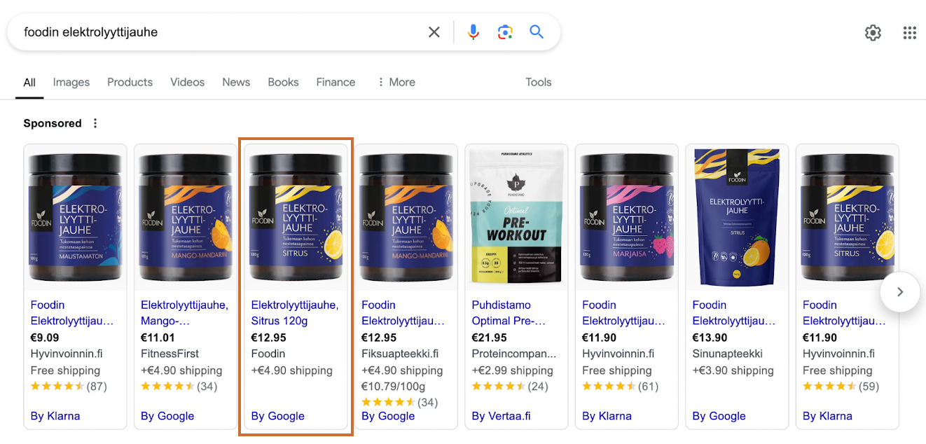 Vasemalla esimerkkikuvassa näkyy sekä valmistajan (Foodin) että jälleenmyyjien Google Shopping mainoksia. Tällaisessa tilanteessa hinta on usein ratkaiseva tekijä trafiikin ohjaamisen suhteen. Mikäli verkkokauppa on luotettava, toimitusajat lyhyet sekä käyttökokemus on hyvä konvertoituu trafikki muita kilpailijoita useammin kaupaksi.